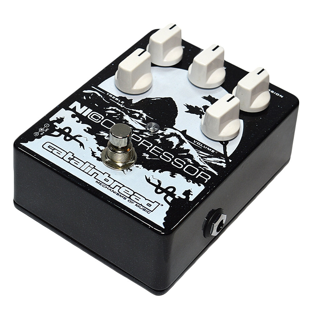 The NICOMPRESSOR (pronounced “Nigh Compressor”) offers distinctive tone shaping capabilities. It achieves exceptional compression dynamics while keeping higher-frequencies intact, making your guitar sound incredibly full and fat, without compromising your tone. In seeking to honor, improve, and expand this concept, Catalinbread developed a broader range of functionality and finely-tuned controls.