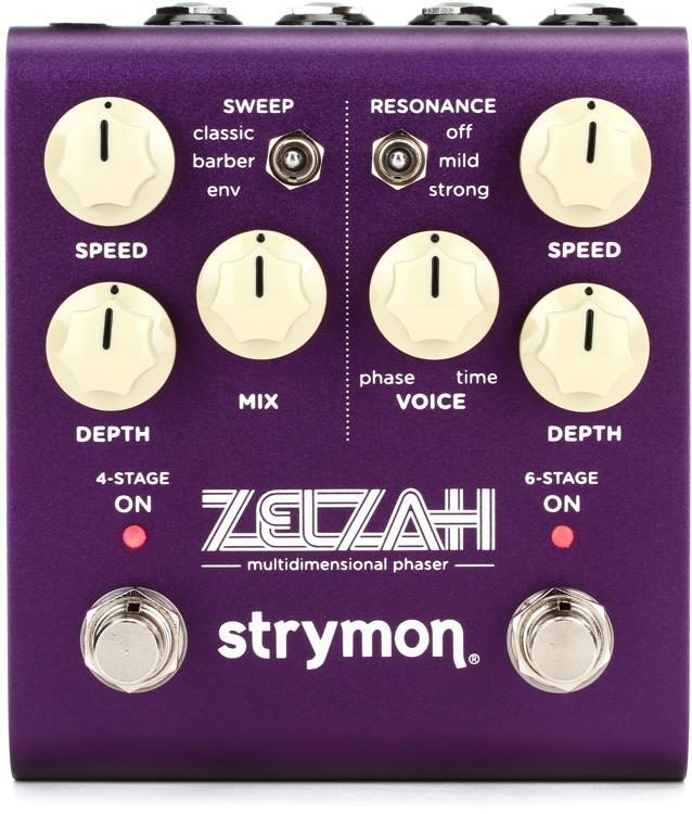 4-Stage phaser with 3 sweep modes: Classic (traditional rising and falling LFO with voicings that change character with DEPTH knob setting), Barber (constant rising LFO with +ve or -ve polarity) and Envelope (touch-sensitive envelope), independently accessible via footswitch and set of controls