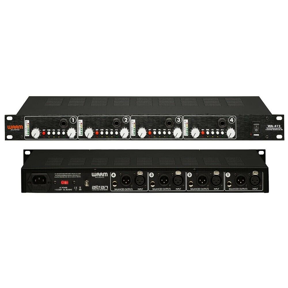 The WA-412 from Warm Audio is a four-channel preamp for microphones and Hi-Z inputs housed in a 1 RU chassis. It's fashioned in the American console preamp style, providing a punchy bottom end and smooth trebles. Each channel gives you 65 dB of gain, polarity switching, a 20 dB pad, 48V phantom power, a switchable impedance selector for tonal shaping, and knobs for both input gain and output; this allows for both precise and creative gain structuring of sound. You can easily watch your signal via the on-board LED meter for every channel.