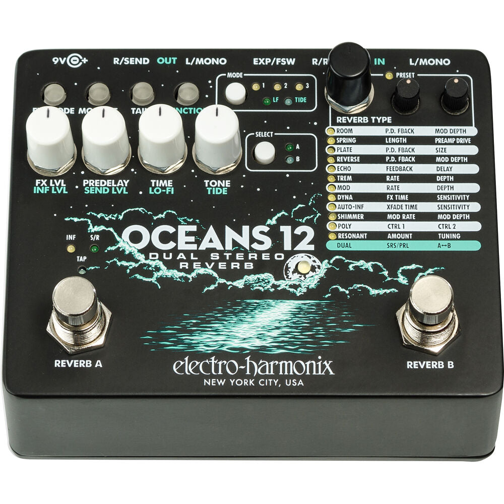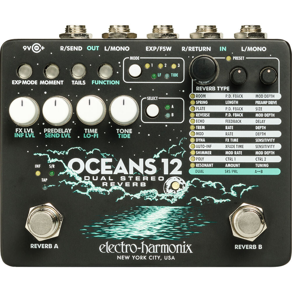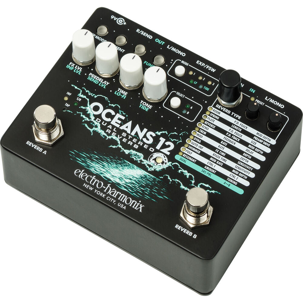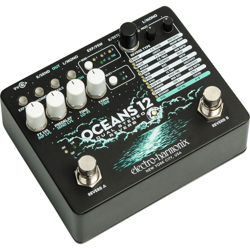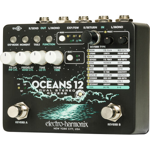 The Electro-Harmonix Oceans 12 is a dual stereo reverb, perfect for adding everything from a little bit of space to deep cavernous reverbs. It features two simultaneous independent reverb engines with either series or parallel operation. Twelve reverb algorithms are available to choose from including room, tremolo, and resonant reverbs. It can be used in stereo mode, or the right input and output can be used a mono effects send to add another effect in the signal chain. The Tide control alters the stereo image and can be used to add continuous stereo interest.
